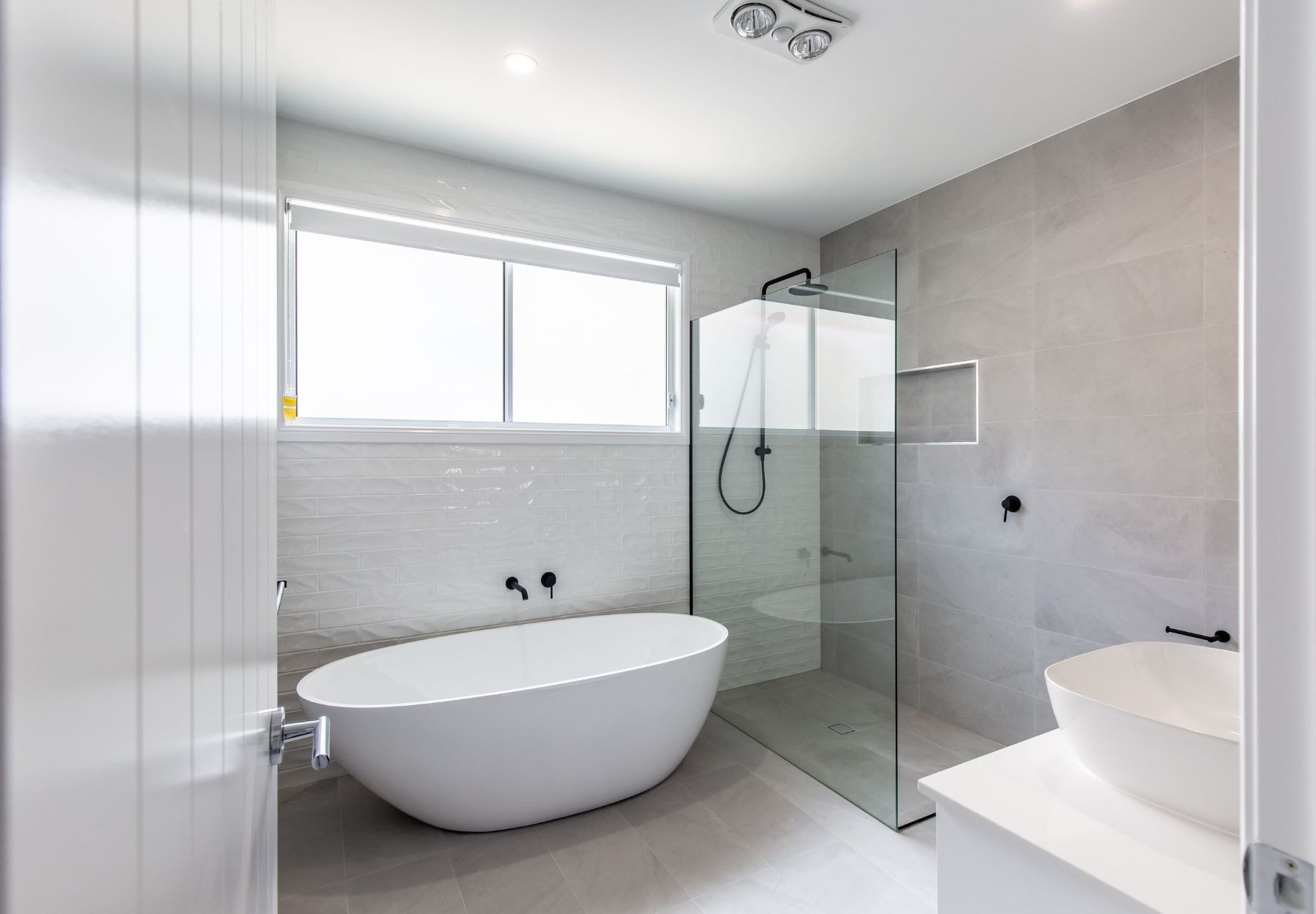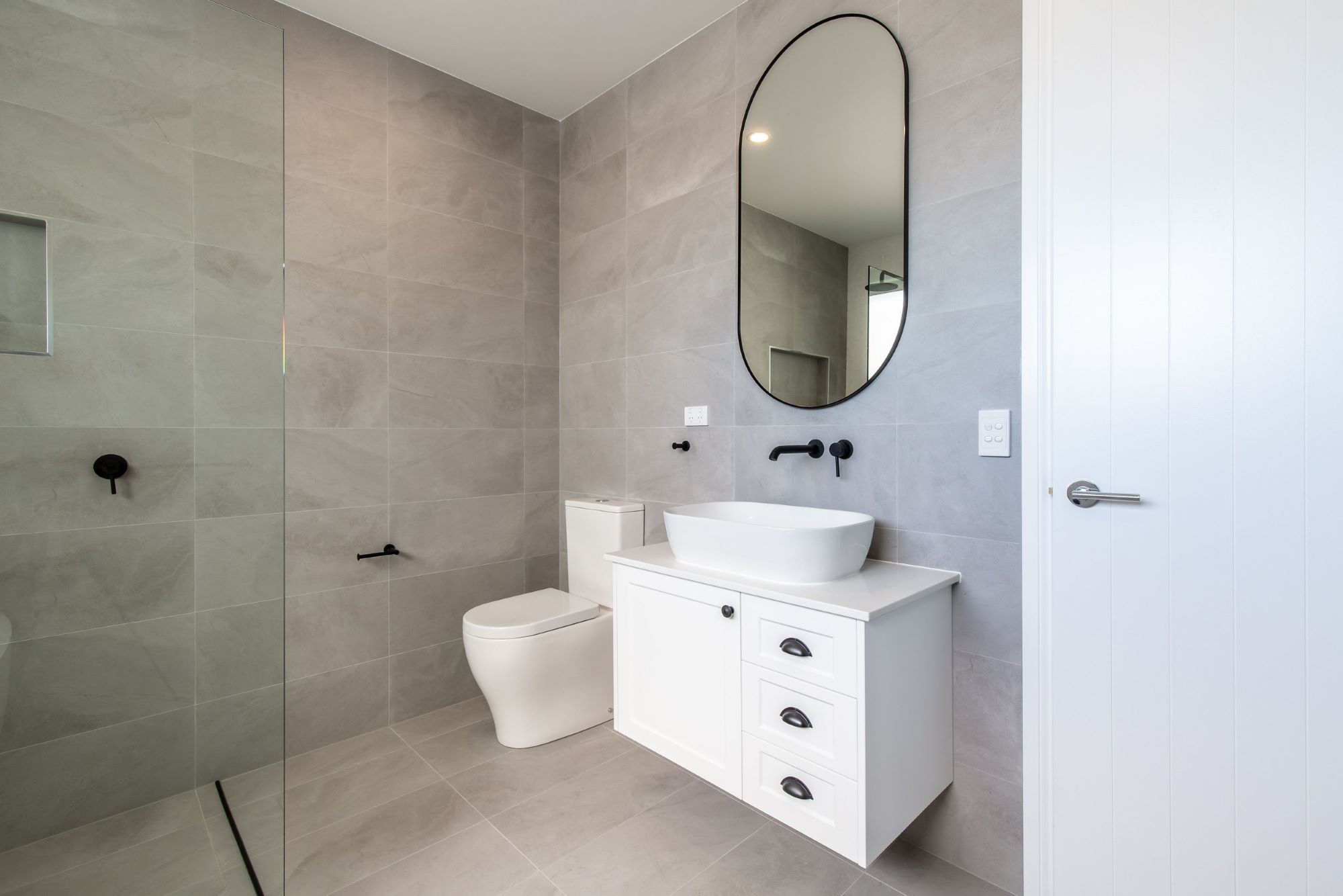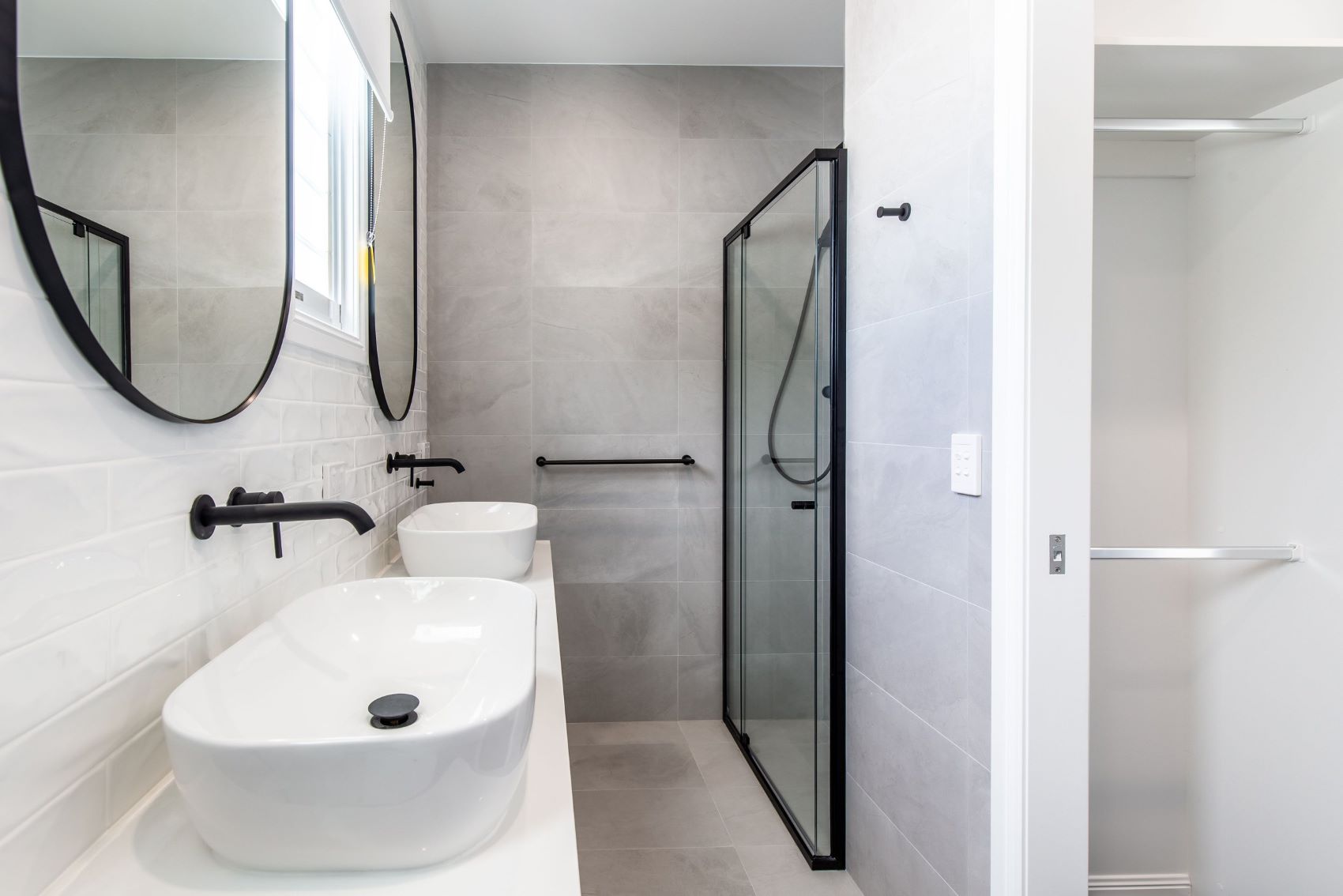 Three bathrooms in each dwelling, featuring full-height tiles, tiled feature walls, and black tapware
