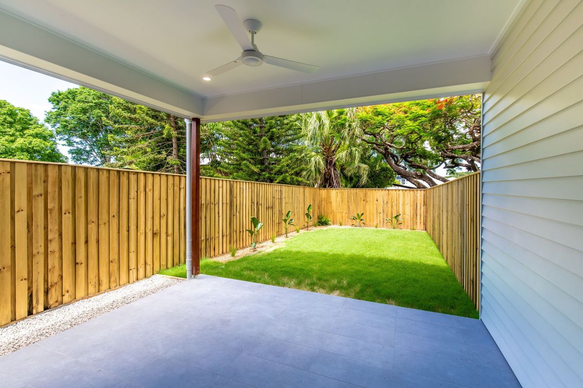 Landscaped outdoor areas with fencing and exposed aggregate driveways