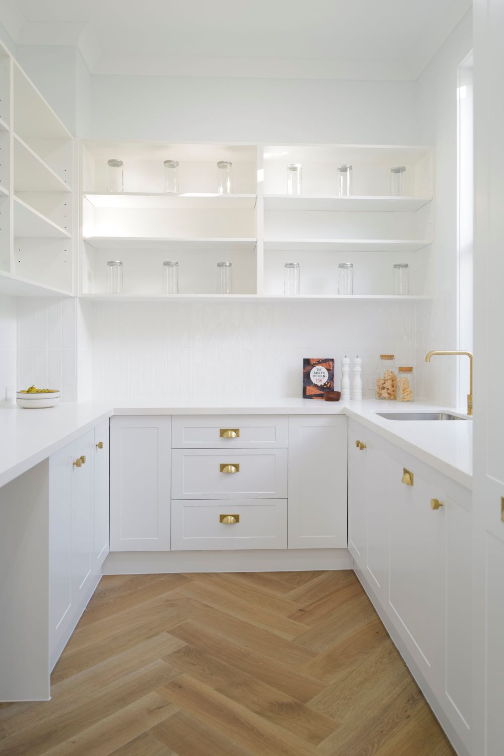 Kitchen with gold tapware and matching accessories, flowing into a walk-in pantry